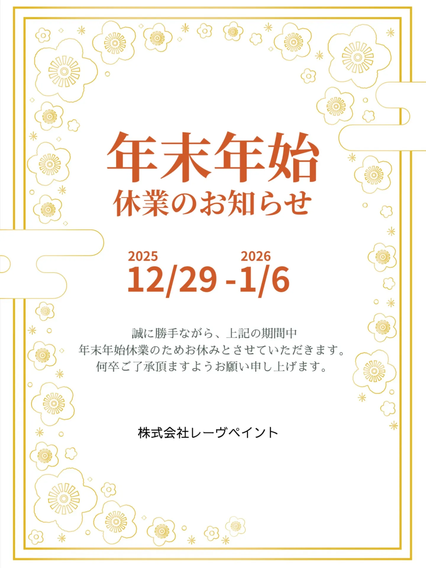 本年は格別のご愛顧を賜り厚く御礼申し上げます。 2025年12月29日(月)より2026年1月6日(火)まで年末年始休業とさせていただきます。ご迷惑をおかけいたしますが、何卒ご了承くださいますようお願い申し上げます。 2026年1月8日(水)より通常営業順次対応をさせていただきます。来年も引き続きよろしくお願いいたします。